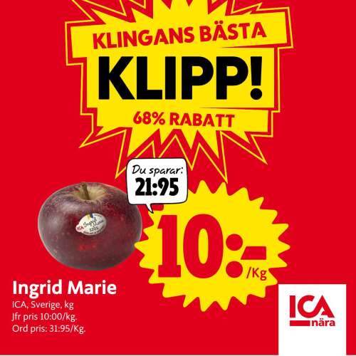 Vi fick tag på ett klipp Svenska Ingrid Marie äpplen för 10:-/kg! En pall har vi och priset gäller så långt lagret räcker. Dock längst t.o.m 23/11