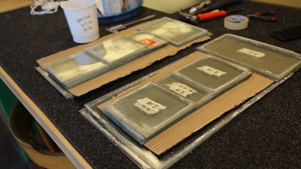 Gamla fönsterglas, varsamt bortplockade från sina bågar, står i prydliga högar på arbetsbänken. Foto: Mirjami Alanen