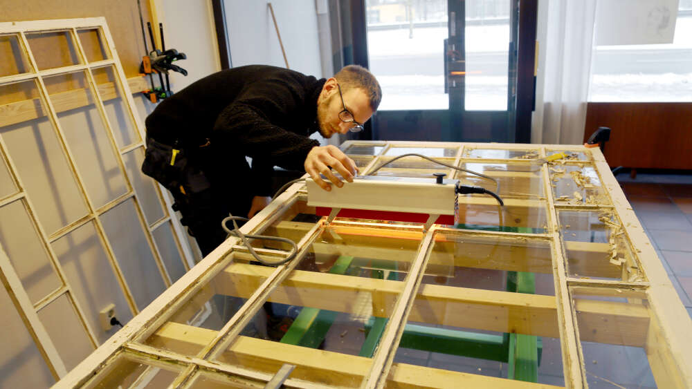 Erik ställer in apparaten som ska värma upp gammalt kitt för lättare borttagning. Foto: Mirjami Alanen