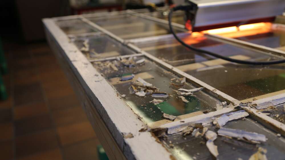 Han visar spår av tidigare renoveringar: traditionellt linoljekitt blandat med modernare syntetiskt. Färgskikt som avslöjar decennier av målningar. Och trä som torkat och spruckit efter många års väderväxlingar.