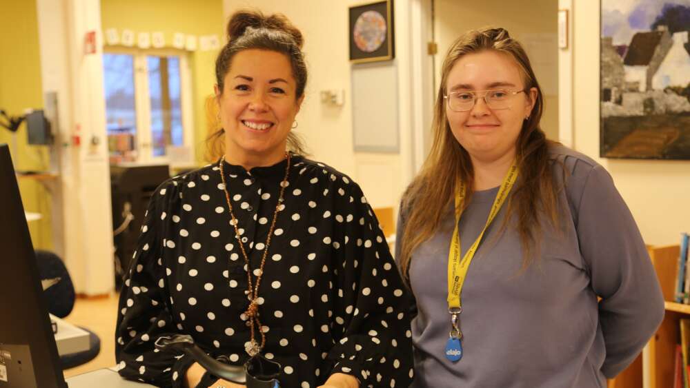 Biblioteksassistent Caroline Wiklund och bibliotekarie Sara Hasselblad vid biblioteket i Sävsjö. Foto: Mirjami Alanen