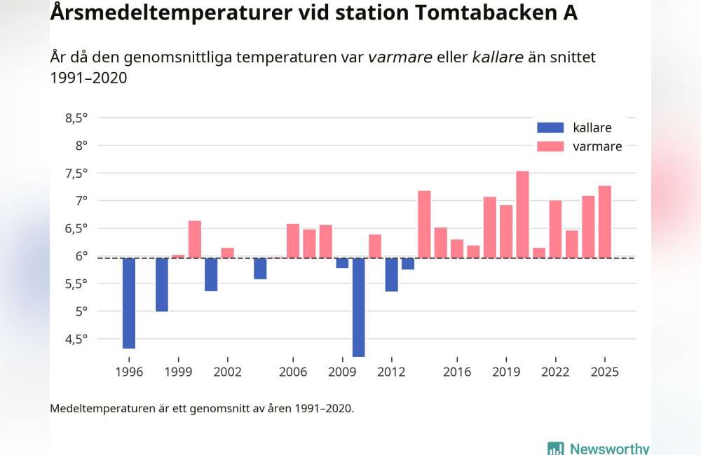 2025 blev ett av de varmaste åren som uppmätts på jorden, och även i Sävsjötrakten har årets temperaturer legat klart över det normala. Vid mätstationen Tomtabacken A, uppgick årsmedeltemperaturen till 7,3 grader, vilket är 1,3 grader över genomsnittet för de senaste decennierna och den näst högsta noteringen sedan 1996.