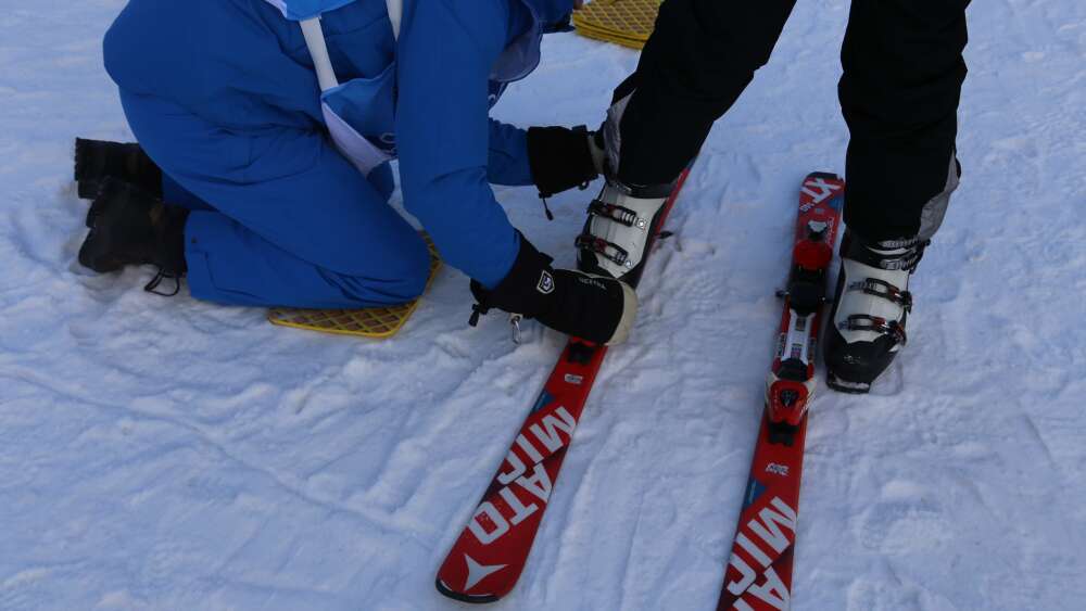 En elev får hjälp av en mer erfaren skidåkare. Foto: Mirjami Alanen