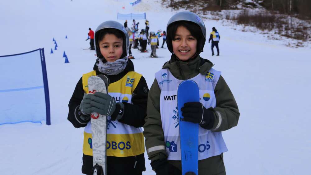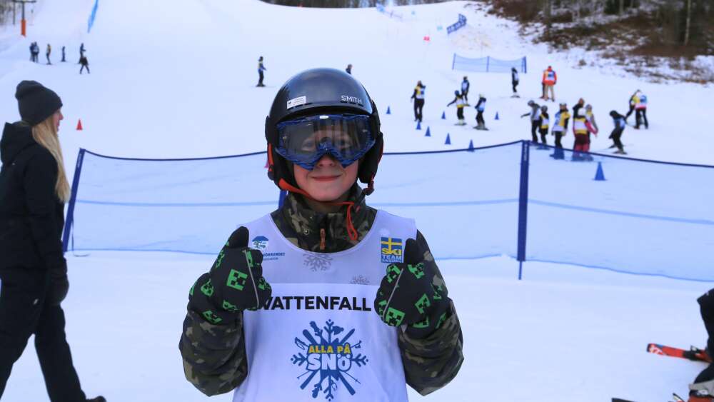 Ett av barnen är Alvin Olsson, som precis har tagit sig ned för backen. Han berättar att han har åkt skidor två gånger förut, men har ändå på sig en väst som signalerar att han behöver extra stöd under dagen.